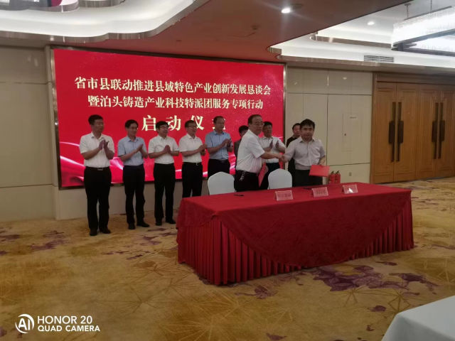 6月24日,省市县联动推进县域特色产业创新发展恳谈会暨泊头铸造产业科技特派团服务专项行动启动仪式在我市举行。沧州市委副书记、市长向辉出席活动并讲话,省科技厅党组成员、副厅长高建锋为泊头铸造产业科技特派服务团授旗,市领导张荣霞、王志亮、沈军、李万友出席活动。